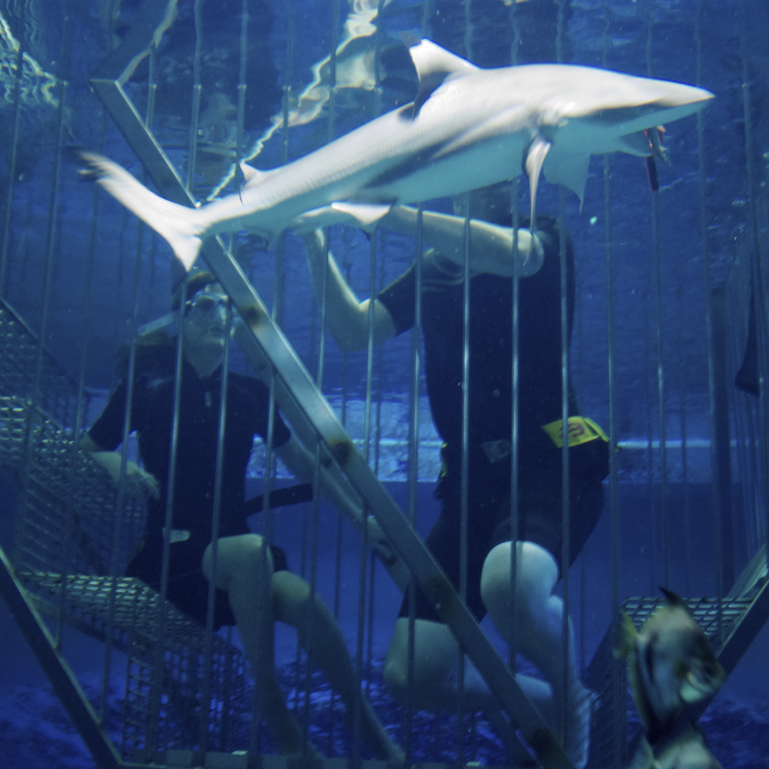 Wetsuits aan en naar boven. De haaien leken toen een stuk groter. Klopte ook, het glas van 7,5 cm is verkleinend. Ik vond de haaien eigenlijk ineens niet zo eng meer. Maar de eerste keer met je ogen open (wel met duikbril) onder water vond ik wel een dingetje. Maar eenmaal onder was het echt zo cool. Je vergeet het natte koude pak, het vieze zoute water en waant je helemaal thuis in de onderwaterwereld. Met 5 kg gewicht om ons middel bleven we rustig een tijd onder water. Met een lange grijphand met inktvisjes eraan voerden we eerst de roggen en later andere visjes aan de haaien. Bleken ze hartstikke slecht te zien. Ik had ondertussen al bijna 3 extra neusgaten bij die haai in zijn kop gestoken, voordat hij snapte dat ik hem een visje probeer te geven. Kom maar vissie vissie, koechie, koechie. Toch gaaf om te kunnen zeggen dat je haaien hebt gevoerd.