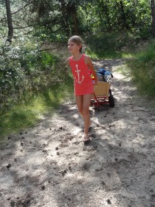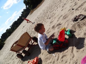 Na een uur (!) bereikten we de zandvlakte. We waren alleen, iedereen is nog aan het zoeken denk ik. Gelukkig vond ze het daar wel top (voor 1 minuut), totdat ze een rode mier zag en uiteraard verslinden die ons met huid en haar, dus hop weer terug in de bolderkar.